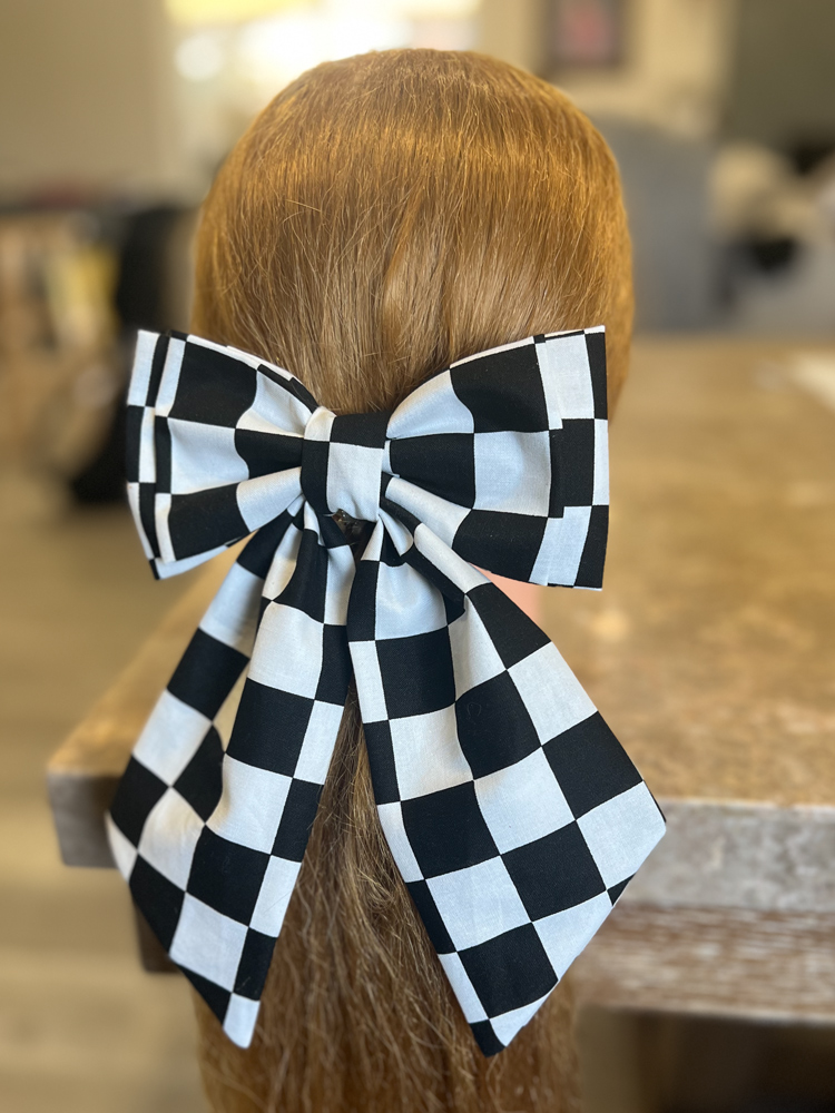 This is a large black-and-white checkered hair bow with long tails, styled in a bold statement design that adds a fun, eye-catching touch to any hairstyle.