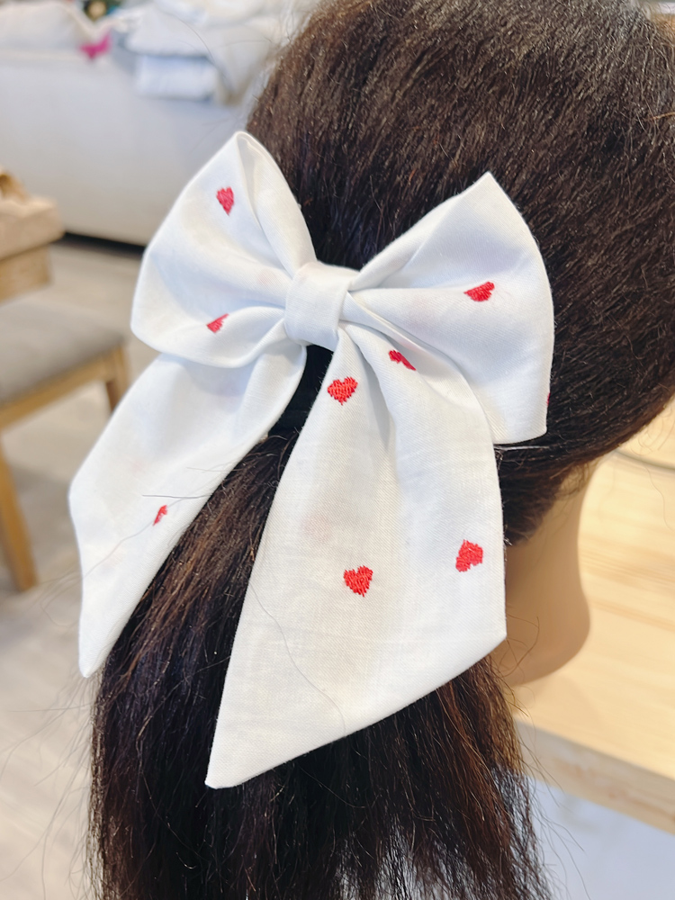 This charming hair bow features a soft white fabric sprinkled with delicate embroidered red heart details for a sweet, timeless look. Thoughtfully structured with long, flowing tails, it adds an elegant yet playful touch to any hairstyle. Lightweight and comfortable, it’s perfect for everyday wear or special occasions—bringing a little love and charm to every outfit.
