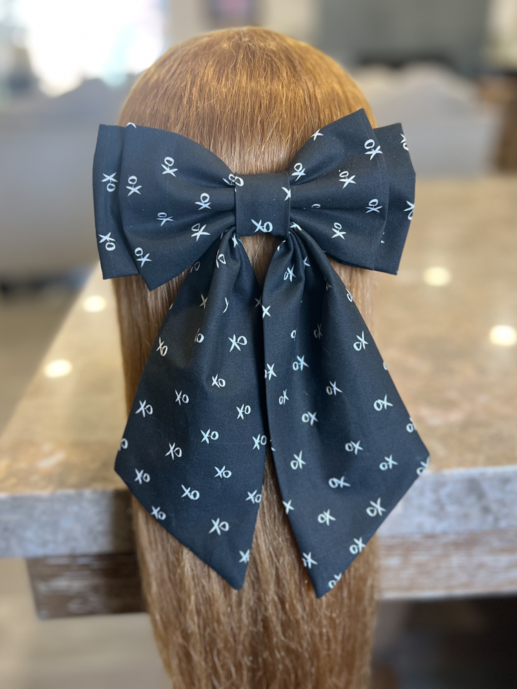 This Wednesday-inspired bow features a bold black fabric patterned with subtle white “XO” designs. Its oversized shape with long, flowing tails adds a dramatic, gothic-chic touch—perfect for fans of Wednesday Addams style or anyone who loves a statement hair accessory.