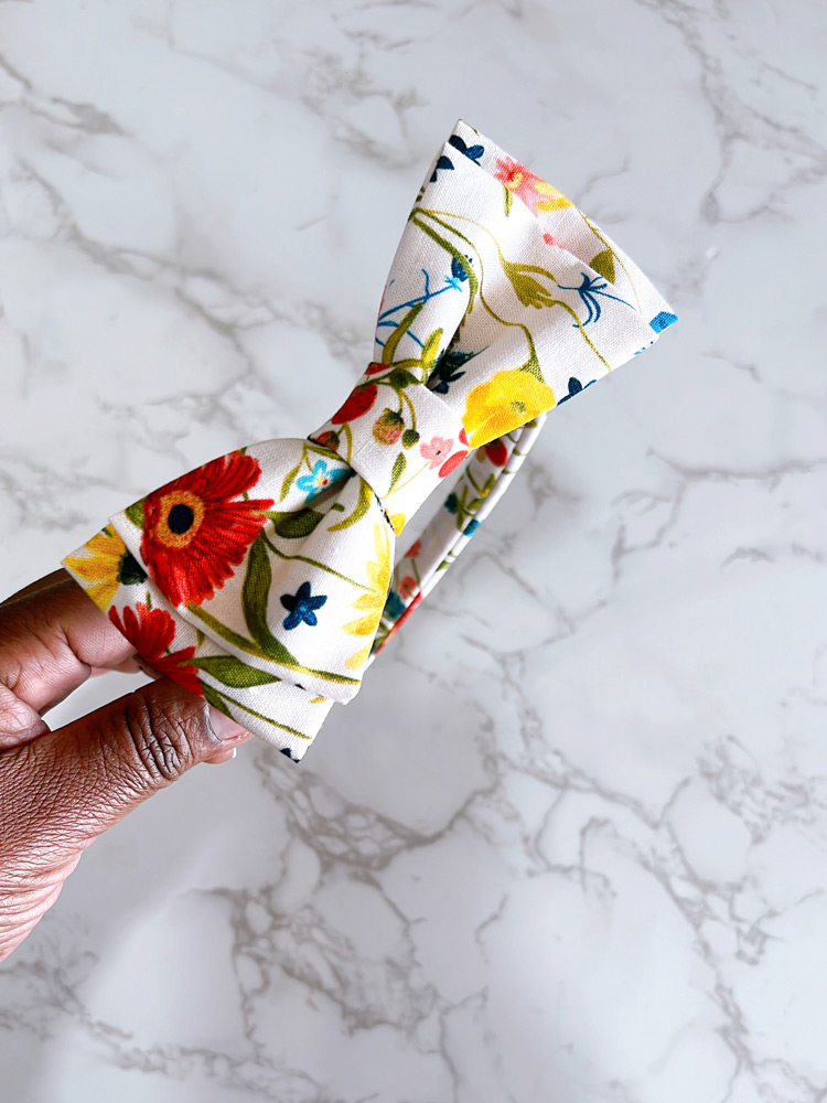 This sweet hard headband with bow features a delicate floral print on a soft ivory background, accented with cheerful blooms in red, yellow, and blue. Lightweight and perfectly sized, it adds a fresh, playful touch to everyday outfits, spring celebrations, or sunny adventures. Thoughtfully handmade for a secure and comfortable fit.