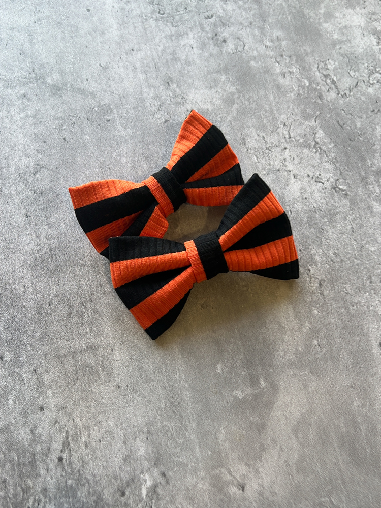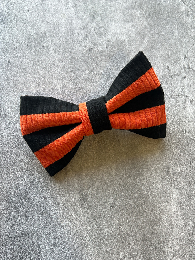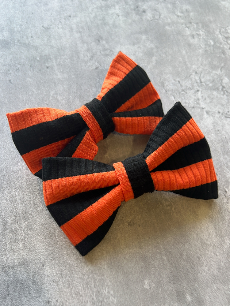 Orange and black striped ribbed knit bow just in time for Fall season. Wear as a single or double for pigtail bows.