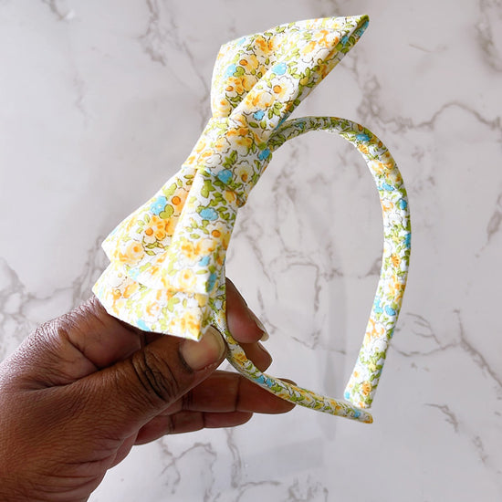 This sweet hard headband with bow features a delicate floral print on a soft ivory background, accented with cheerful blooms in yellow and blue. Lightweight and perfectly sized, it adds a fresh, playful touch to everyday outfits, spring celebrations, or sunny adventures. Thoughtfully handmade for a secure and comfortable fit.